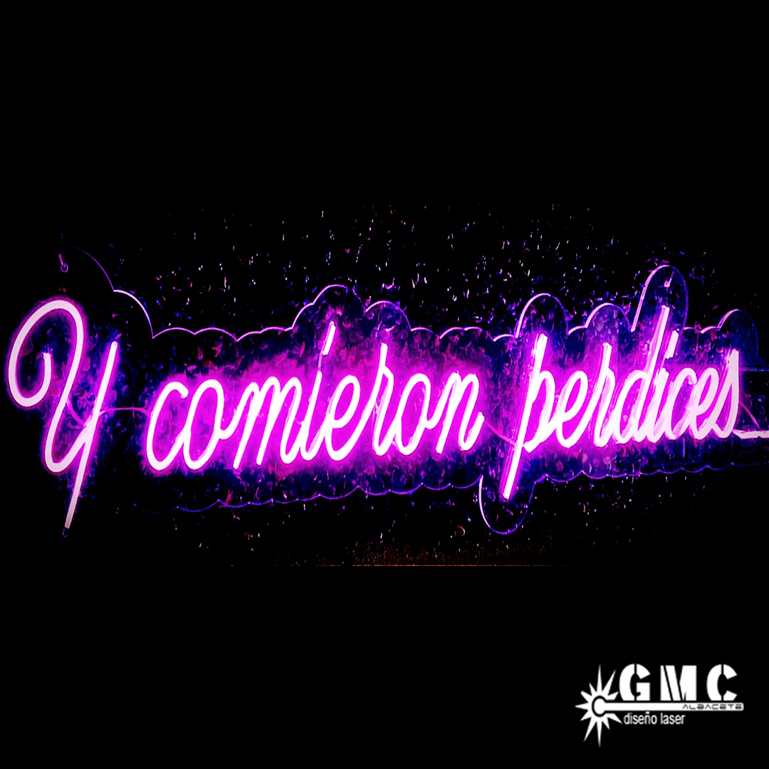 Uno de los neones más demandados es Y comieron perdices… tiene un tamaño 122×27 cm hecho sobre una base acrílica mecanizada con tu diseño y que sirve para la fijación del neón flexible se pueden personalizar para adaptarse a tu negocio, evento o incluso decorativo para una vivienda, ya sea en color, tamaño, forma o diseño